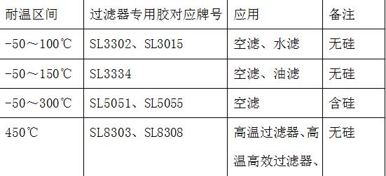 我們將過(guò)濾器專用膠按所需的耐溫區(qū)間來(lái)分類,供您參考,具體如下表: